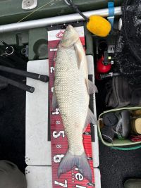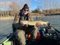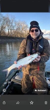 Wir versprachen uns viel, da wir eine Stelle im Rhein fanden, wo die Wassertemperatur sogar 8,9°C hatte. Durch den Anstieg des Rheins kam eine Menge Dreck den Rhein herunter. Wir hatten den ganzen Tag über drei Bisse auf Gummifisch und konnten einen Rapfen von 70cm fangen. Petri.