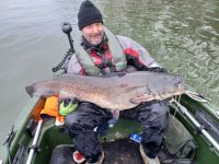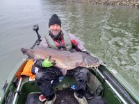 Wir fanden eine Stelle im Rhein, wo die Wassertemperatur bei 7,9°C lag. Wir fingen ein paar Nasen auf die 40g Rute mit kleinen Gummifischen. Auch ein Rapfen war dabei. Es gab noch ein paar Fehlbisse bevor es einen heftigen Einschlag auf Ralfs Rute gab. Nach gewaltigem Drill in der Hauptströmung konnte Ralf einen 1,60m langen Waller mit dem leichten Gerät landen. Petri.
